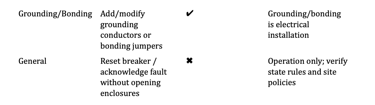 Legend: ✔ = typically requires journeyman electrician or registered apprentice under supervision; ✖ = typically does not require electrician license (mechanical/operations-only), assuming no wiring/terminations are altered.